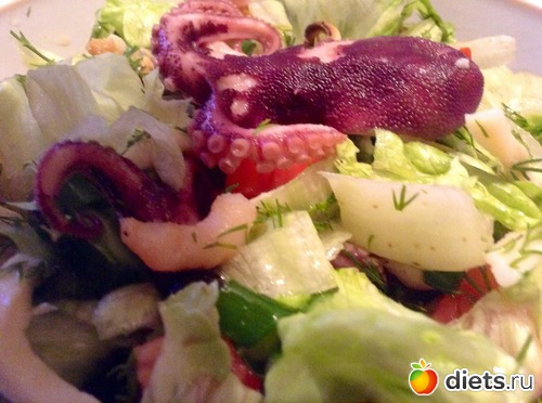 Ужин - салат с морским коктейлем (осьминожки, мидии, креветки, кальмары)