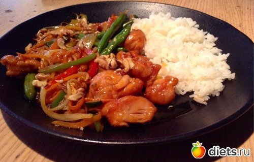 Обед - курица по-сычуаньски с рисом на пару и жасминовый чай, нектарин на десерт по выходе из кофейни