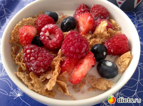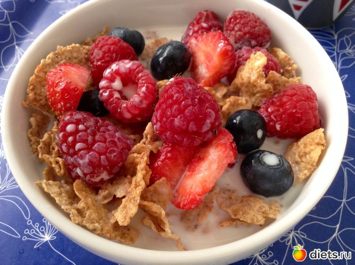 Завтрак - хлопья с ягодами и молоком: