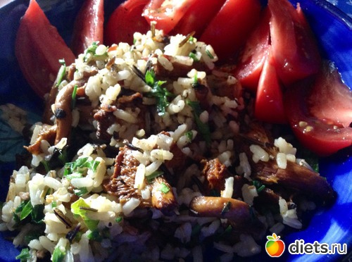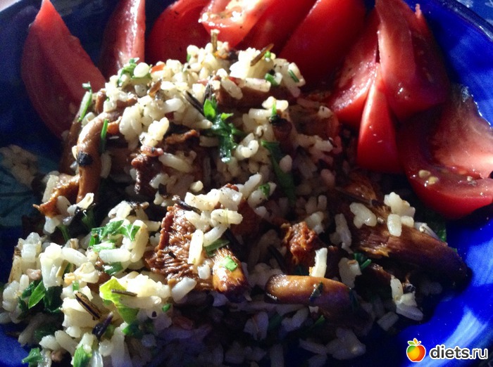 Обед - нечто вроде ризотто с лисичками и помидор: