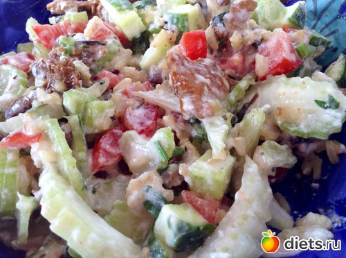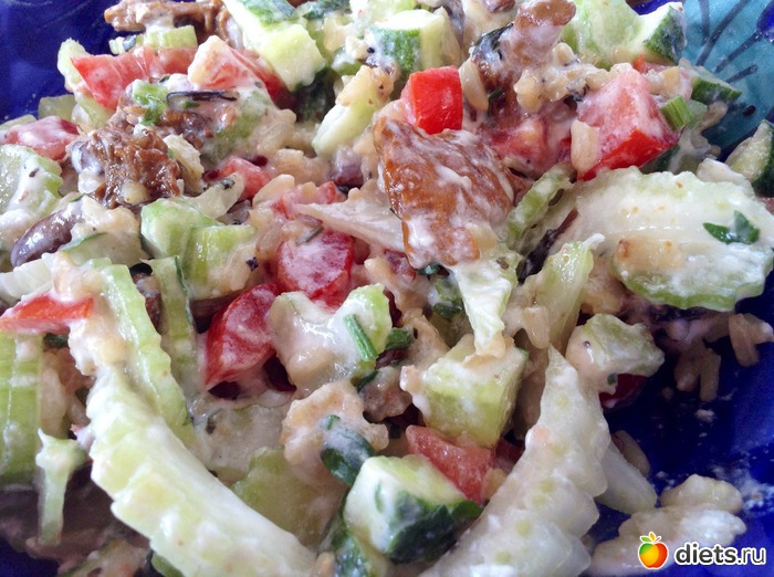 Ланч (12.00) - сделала салат из остатков смеси риса с лисичками, помидора, огурца, сельдерея, заправила простоквашей.