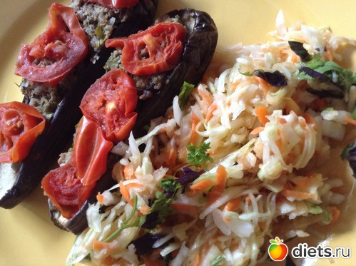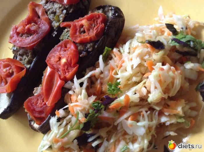 и баклажаны, фаршированные телятиной с зеленью и помидорами, и капустно-морковно-яблочный салатик:
