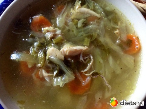 Обед (15.00) - щи зеленые с курицей (видна одна капуста, но в щах не меньше щавеля):