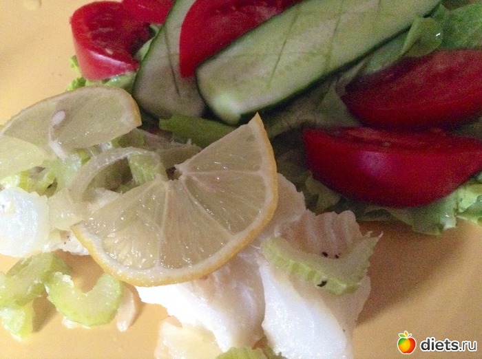 - треска, тушенная с сельдереем и луком (без капли жира), огурец, помидор, салат: