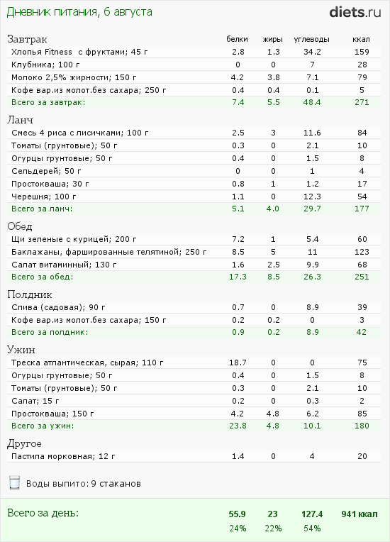 Вот что было сегодня в меню (показываю только еду, 2 раза пила кофе, остальное - вода).