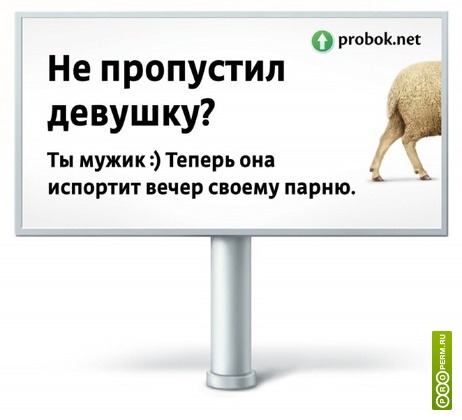 Пробок.нет умудрились сделать сексистский щит, который унижает и мужчин и женщин. Мужчин сравнили с баранами, которые не пускают девушек за рулем, а девушек обозвали истеричками, которые из-за такой фигни готовы вынести парню мозг.