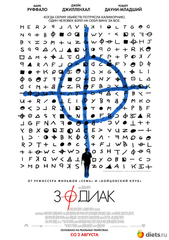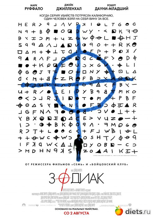 Описание фильма: В небольшом американском городке происходит двойное убийство. Убитыми оказываются двое местных подростков. Это убийство вызывает бурную реакцию в прессе, но полицейским так и не удается найти убийцу. А через некоторое время происходит еще одно двойное убийство, очень похожее на первое. В полицейский участок приходит письмо от предполагаемого убийцы. В письме маньяк называется себя Зодиаком и сообщает, что убийства будут продолжаться. Так же в письме находится шифр, разгадка которого, по словам автора письма, может пролить свет на личность убийцы.
