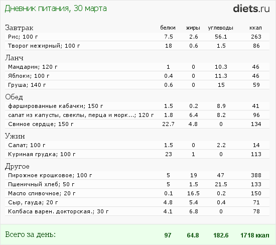 К сожалению, после воскресных нарушений никак не могу прийти в норму. Сегодня дважды нарушила принципы ДД. Во-первых, не смогла отказаться от угощения в виде 2 небольших самодельных пироженных картошка (в первой половине дня), а потом вечером зашла к подруге и она напоила меня чаем с 2 бутербродами (один - с сыром, один - с колбасой). Одним словом, что-то я совсем расслабилась!!! Вес, к счастью, стоит (хоть вверх не ползет, и то хорошо). Что будет завтра - не знаю. Ходила сегодня на Пилатес, много ходила пешком в быстром темпе, позанималась в зале на тренажере и, конечно, утром сделала зарядку. Так что будем надеяться, что хоть часть лишних калорий израсходуется по назначению. Завтра постараюсь держать себя в рамках.