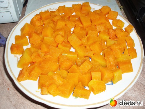 Тыкву порезать кубиками и приготовить в микорволновке, распределив ее одним слоем на большой тарелке на максимальной мощности на 10 мин. В оригинале было поджарить кусочки на сливочном масле, но я борюсь за минимум калорий и такой способ меня устроил.