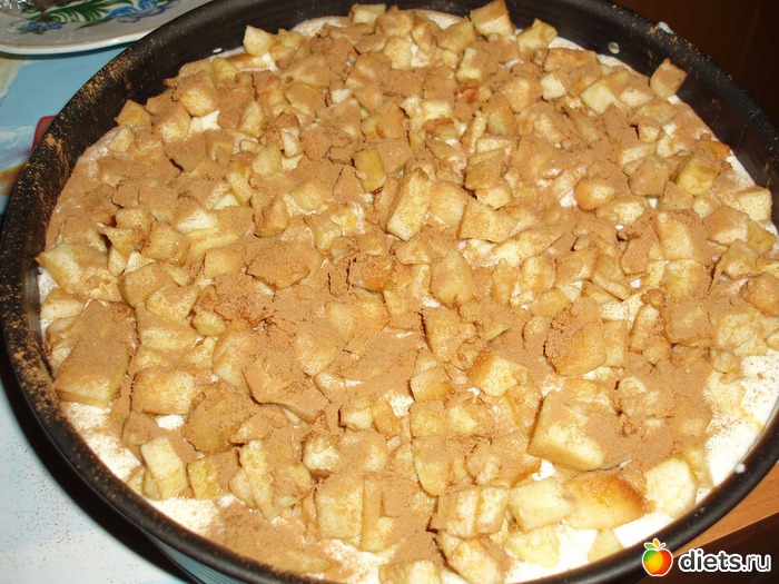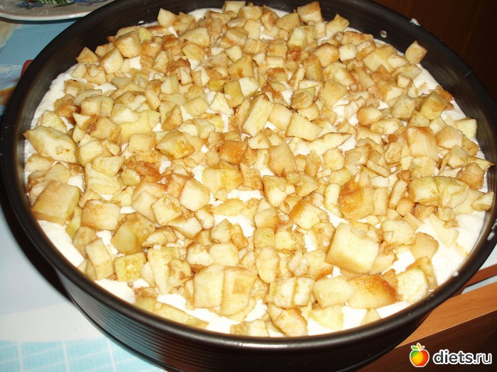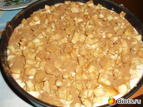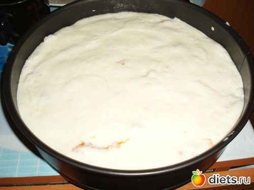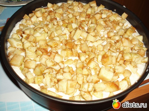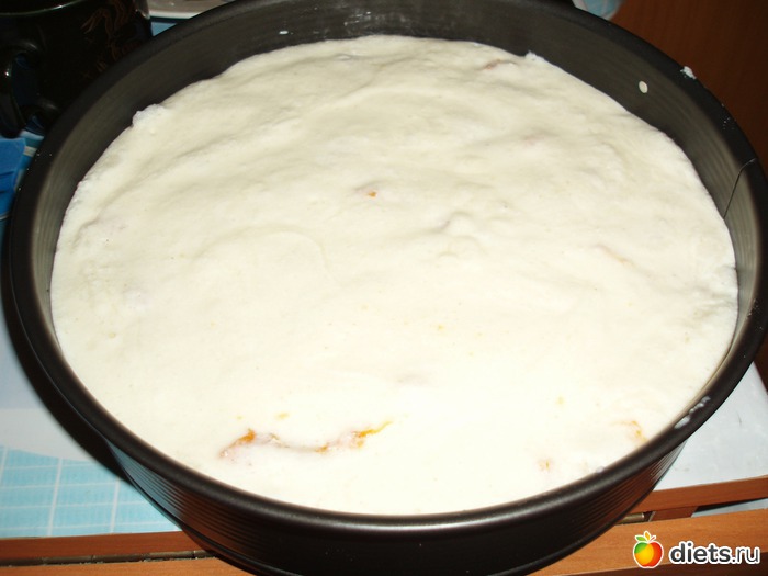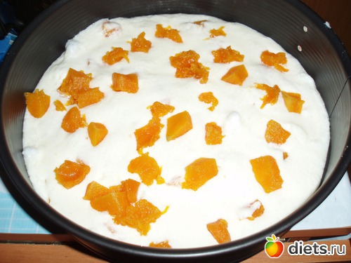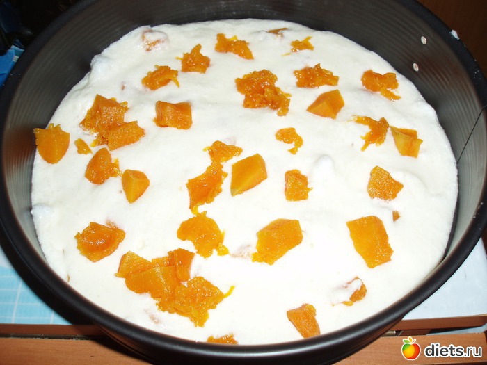Теперь на смазанную разъемную форму( можно ее еще манкой посыпать если она без антипригарного покрытия) выливаем слой теста, а затем посыпаем его частью тыквы, не густо ее разбрасывая. Опять слой теста и тыквы...