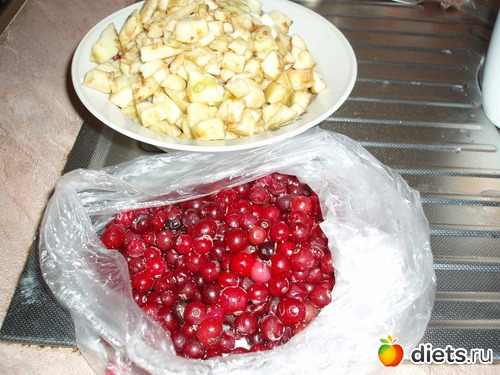 Яблоки приготовить- порезав их на кубики без кожуры и косточек. И клюква уже наготове.