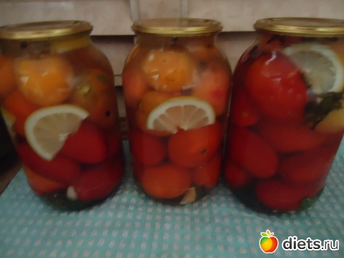 соль +сахар в 2 раза больше чем соли. и дольки лимона уложить в середину банки. Как обычно-стерел. банку складываем помидоры -прокал зубочисткой, один раз заливаю кипятком= стоит минут 10..сливаю..кипячу с солью сахаром...=заливаю и закатываю... Красиво, вкусно, оригинально.