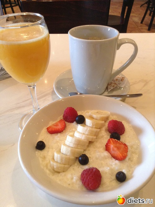 завтрак: апельсиновый фреш, рисовая каша с бананом и ягодами, кофе:
