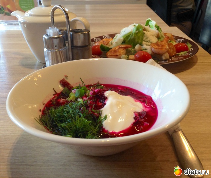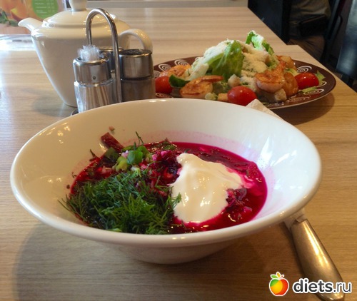 Обед - свекольник, "Цезарь" с креветками на гриле, зеленый чай: