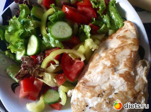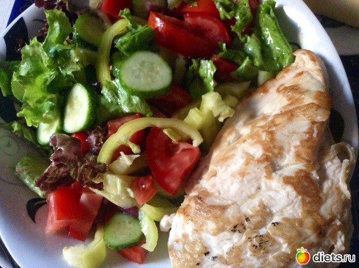 Ужин - куриная грудка на сухой сковороде, салат из помидоров, огурцов, перца:
