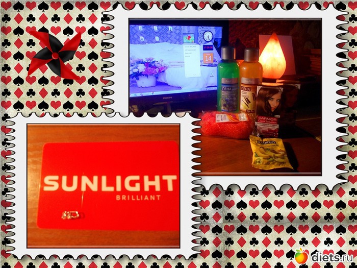 В подарок мне достались дисконтные карты двух магазинов - хозяйственного и с золотом и бриллиантами, соль для ванн и серебряная подвеска с фианитом: