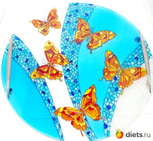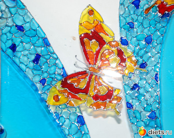 Материал: стекло, Витражные краски, контур по стеклу, хрустальная паста, Лак по стеклу, очумелые ручки и идея)))