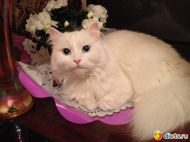 Вот такое белое чудо живет у меня больше года. Появилась она у меня чисто случайно. Взяла у знакомых, потому что у ребенка появилась аллергия на кошек, и родители решили отдать своего питомца в деревню. Я не смогла позволить им это сделать, так как кошка глухая. Она ангорка с голубыми глазами.