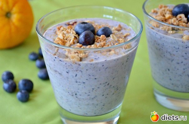 - Овсянку залить йогуртом/кефиром, добавить пюрированный банан и чернику (можно просто все ингредиенты соединить и взбить в блендере)