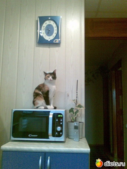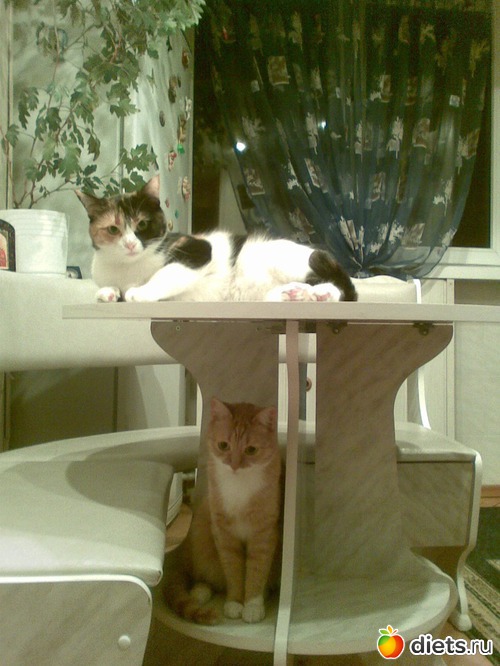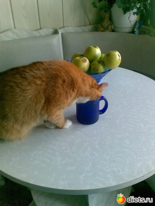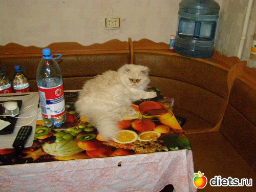 Моя сидит на столе, да еще из моей тарелки еду пытается стащить.