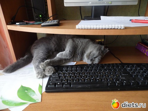 С кухонного стола я их гоняю, но безуспешно - а вот мой рабочий стол, вместе с компом, за-мониторным пространством, рукой на мышке и коленками - считают своей полноправной вотчиной. Раньше спали вдвоем - между мной и монитором. Сейчас две не влезают