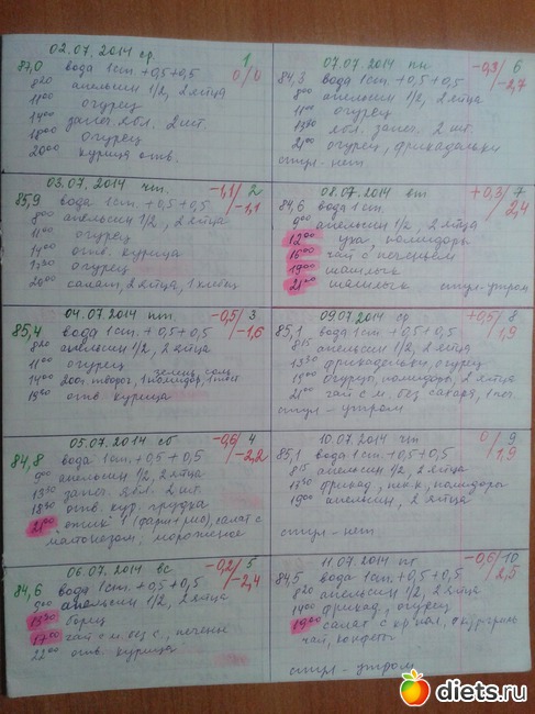 Утром всегда выпивала натощак 1 стакан воды с 1 ч.л. меда (когда-то читала, что сидящим на диете можно есть мед), помогало от болей в желудке и от изжоги. В течение дня выпивала по 1 литру воды. По диете разрешается пить чай или кофе, но я чай не пила совсем, чтобы не было соблазнов съесть печенье или др. выпечку. Ежедневно вела дневник питания (см. фото). Маркером выделены нарушения.