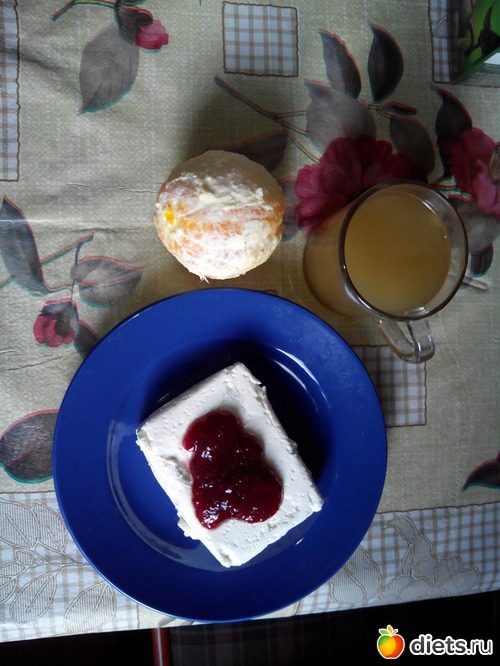 Завтрак...кофе зеленый, творог с джемом и апельсин...