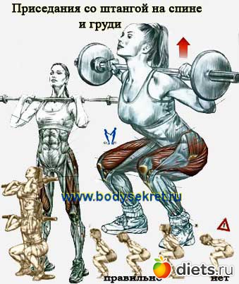 • Приседания со штангой (для девушек не большой вес) на плечах.