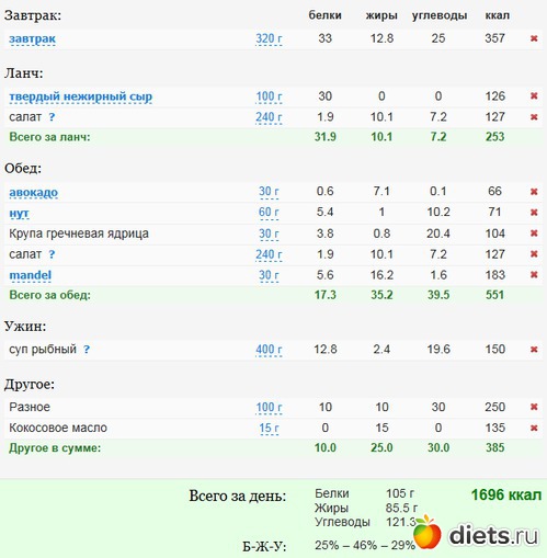 Но у меня спорт каждый день, 3 раза силовые тренеровки. Поэтому ем довольно много. Если убрать вам "разное", то должно по калориям подойти.