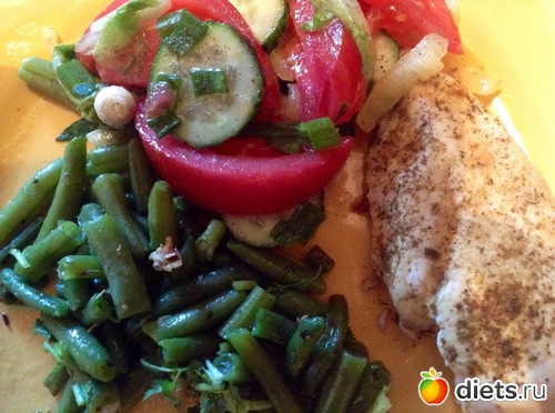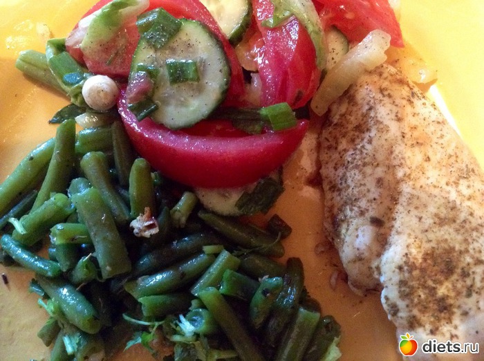 Ужинала дома, куриной грудкой с сухой сковороды, зеленой фасолью, салатом: