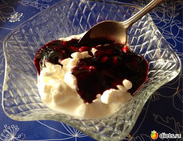 Завтрак рано утром дома - сок, кофе, зерненый творог (100 г) с ложкой черничного варенья: