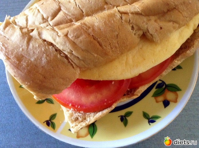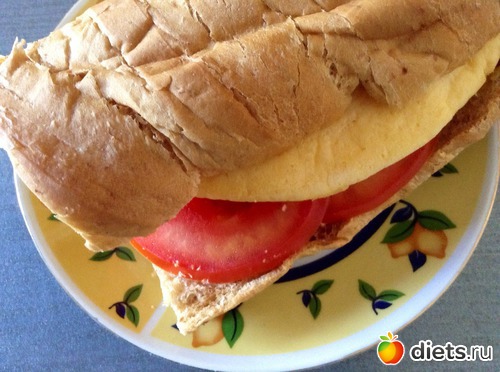 Завтрак по приходе на работу (с утра была у нотариуса, к 12 часам проголодалась) - саб с омлетом и помидором: