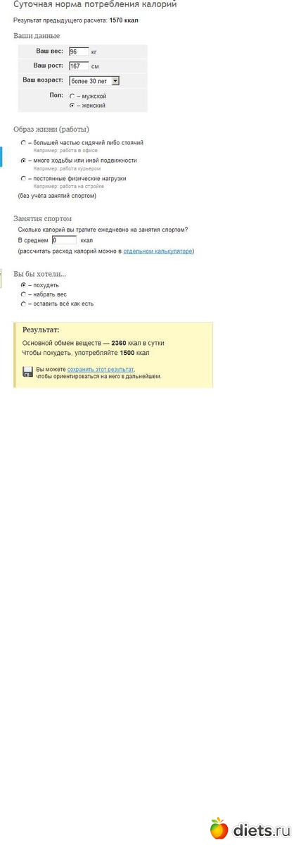 А когда человек жил на 1500, то переход на те же кашки с салатиками и куриным филе дает снижение калорийности в 20-30%.