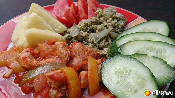 Обед: пепероната с индюшкой, лобио с яйцом, помидорка, огурец и картофель