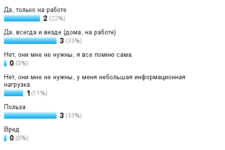 Завела на почте календарь с напоминалками. Полностью планирую свой день (пока только то, что касается работы). Избавилась от записок - все что нужно сделать я сразу вношу в календарь. Три недели его использования пролетели мгновенно. Когда начинала использовать, думала: "Попробую пару дней, а там как пойдет" Сложно было себя контролировать в плане занесения дел сразу, а не потом! Но прошли два дня, три, неделя, две. Я и не заметила! Успевать стала раза в 3-4 больше! Но самое главное, я стала меньше нервничать и напрягаться!