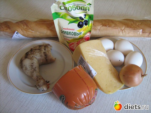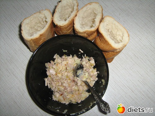 Чтобы утром не тратить много времени, я отвариваю окорочок с вечера и мелко режу готовое мясо. Так же заранее обжариваю мелко порубленную луковицу, Тру сыр. Мясо, лук, сыр смешать, добавить майонез. Багет разрезать таким образом, чтобы получились 4 одинаковых куска, горбушки нам не нужны. Из каждого куска багета вынимаем мякиш, оставляя немного с одной стороны, чтобы у нас получился стаканчик. Мне удобно это делать вилкой.