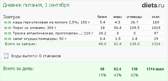 Ну, конечно жиров многовато, а белков мало. Но что было до обеда съедено обратно не выплюнешь. Как видно по дневнику питания - мой пирог показывает ужасающие цифры.