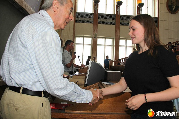 Это она студенческий билет получает лично из рук декана геофака МГУ, Дмитрия Юрьевича Пущаровского.