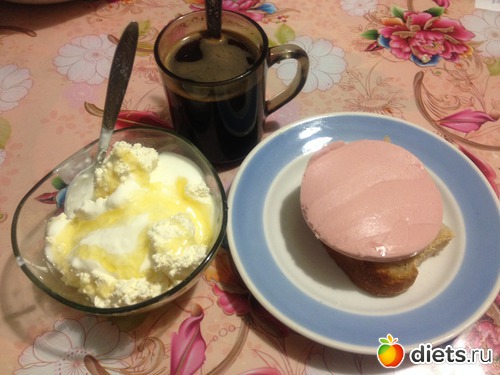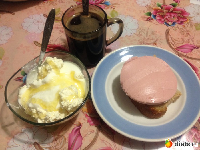 Творог сйогуртом и медом, бутер с колбасой, кофе. Творог опять жирный. Его еще целый килограмм дома, надо доедать. Обещаю больше не покупать