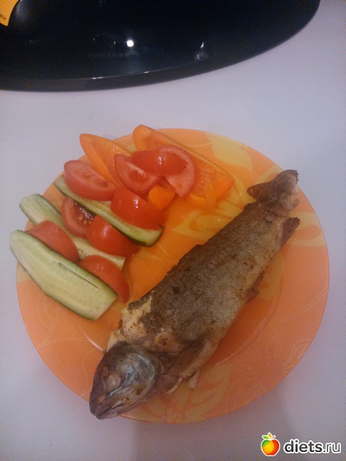 это вчерашняя жареная форель (не разогретая, грею только суп) и ленивый салат)