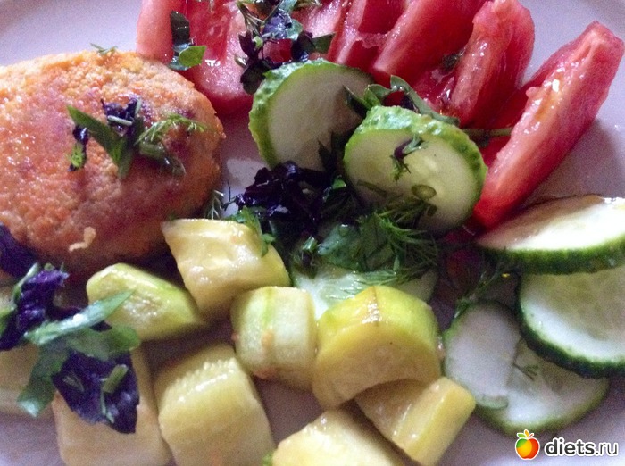 лососевыми котлетками из Избенки с кабачком, помидором и огурчиком.