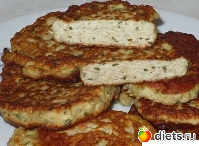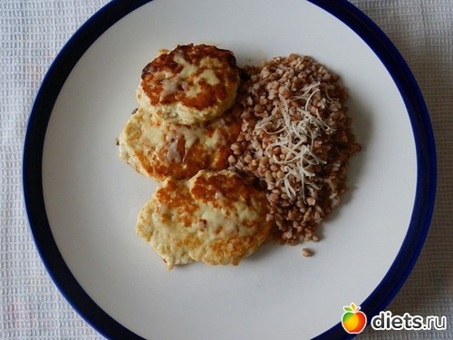 Курогрудку запихиваем в кухонный комбайн, туда же белок яиц, сухие травки, горчичные зернышки, можно добавить чуть обезжиренного молока для воздушности. Все перемалываем и жарим на сухой сковородке (крышкой не закрывать) или выпекаем в духовке. Можно готовые оладьи чуть присыпать 10% сыром.
