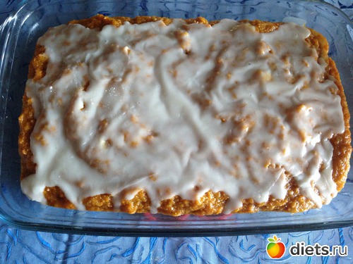 Смешать с морковкой и грецкими орехами. Выложить в форму для запекания диаметром 20 см.