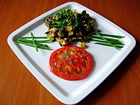 Баклажан нарезать средними кубиками и обжарить на масле в течение 5 минут на сильном огне, добавить уже обжаренный кабачок и нарезанный средними кубиками помидор. Можно оставить дольку помидора для украшения.