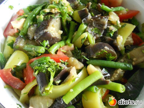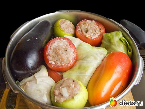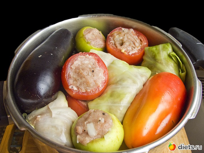 А все овощи прямо так вместе готовятся? А баклажан фаршируется целиком и потом также целиком подается или режется кругами?