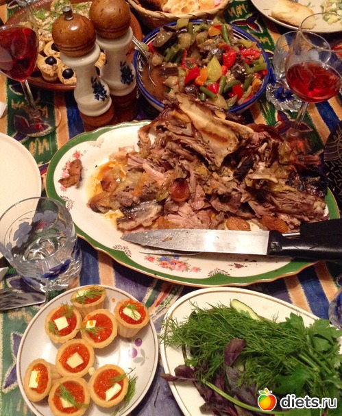 И на моей фотографии вы увидите только тарталетки, баклажаны и остов той самой уточки уже без яблок и прочей картошки.