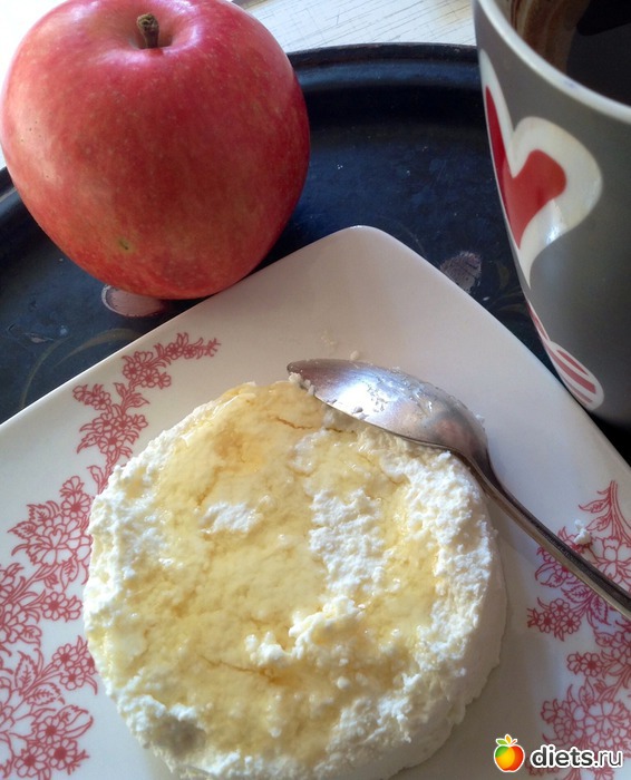Завтрак - творог 1,8% с ложечкой меда, яблоко и кофе.