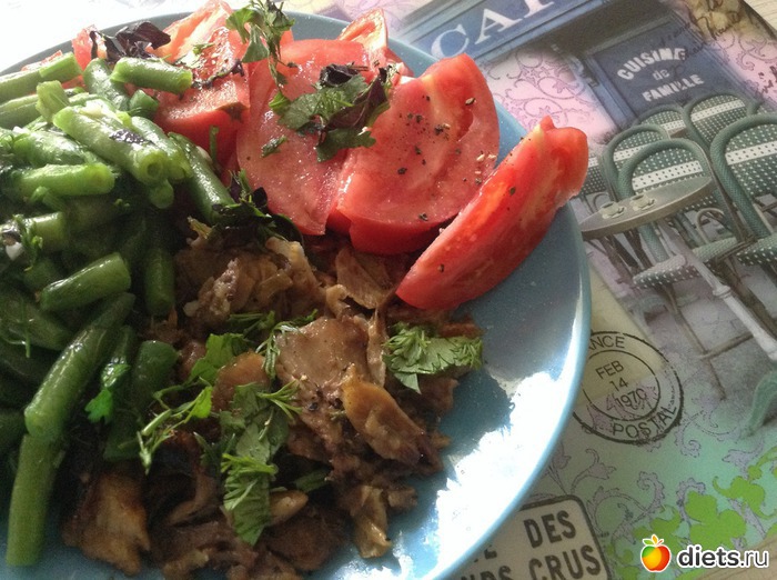 Обед - соскребла с косточек утенка мясца на 100 г, ела с зеленой фасолью и помидором: