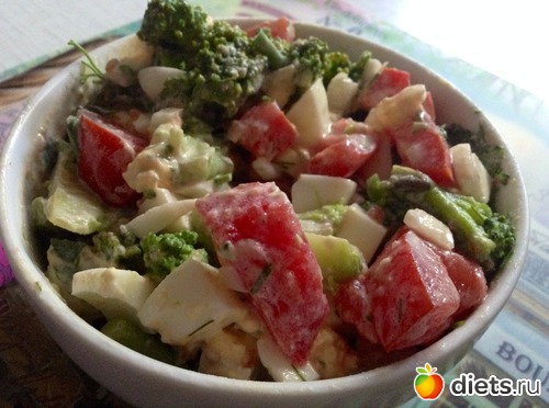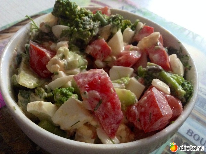 Ужин - салат из брокколи, помидора, яйца с ложкой йогурта: