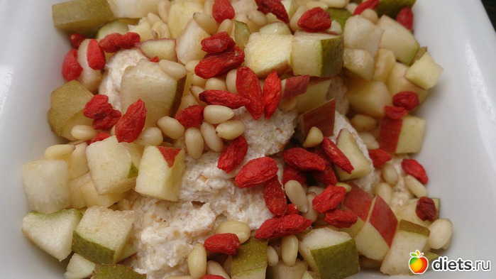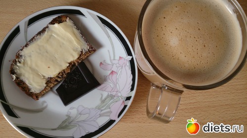 Итак, завтрак: ленивые варенички с яблоком, грушей, годжи и кедровыми орешками, кофе с молоком и сз, половинка белкового хлеба со сл.маслом и кусочек шоколада.